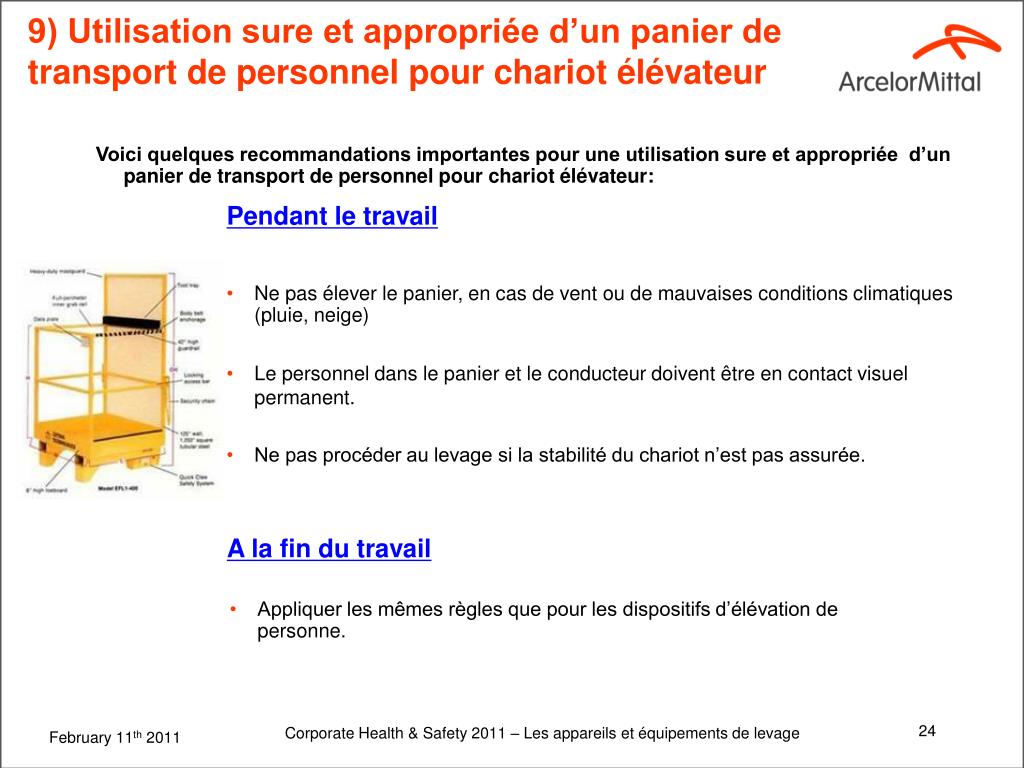 9) Utilisation sure et appropriée d’un panier de transport de personnel pour chariot élévateur Voici quelques recommandations importantes pour une utilisation sure et appropriée d’un panier de transport de personnel pour chariot élévateur: Pendant le travail • Ne pas élever le panier, en cas de vent ou de mauvaises conditions climatiques (pluie, neige) • Le personnel dans le panier et le conducteur doivent être en contact visuel permanent. • Ne pas procéder au levage si la stabilité du chariot n’est pas assurée. A la fin du travail • Appliquer les mêmes règles que pour les dispositifs d’élévation de personne. Corporate Health & Safety 2011 – Les appareils et équipements de levage