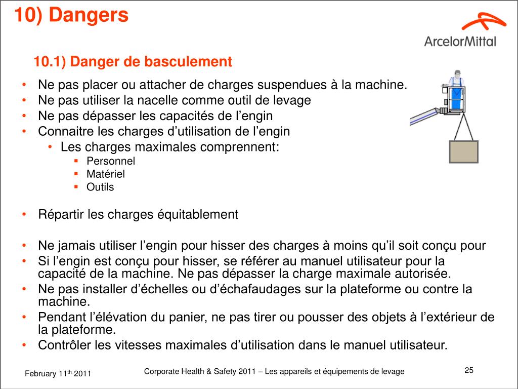10) Dangers 10.1) Danger de basculement • Ne pas placer ou attacher de charges suspendues à la machine. • Ne pas utiliser la nacelle comme outil de levage • Ne pas dépasser les capacités de l’engin • Connaitre les charges d’utilisation de l’engin • Les charges maximales comprennent: • Personnel • Matériel • Outils • Répartir les charges équitablement • Ne jamais utiliser l’engin pour hisser des charges à moins qu’il soit conçu pour • Si l’engin est conçu pour hisser, se référer au manuel utilisateur pour la capacité de la machine. Ne pas dépasser la charge maximale autorisée. • Ne pas installer d’échelles ou d’échafaudages sur la plateforme ou contre la machine. • Pendant l’élévation du panier, ne pas tirer ou pousser des objets à l’extérieur de la plateforme. • Contrôler les vitesses maximales d’utilisation dans le manuel utilisateur. Corporate Health & Safety 2011 – Les appareils et équipements de levage