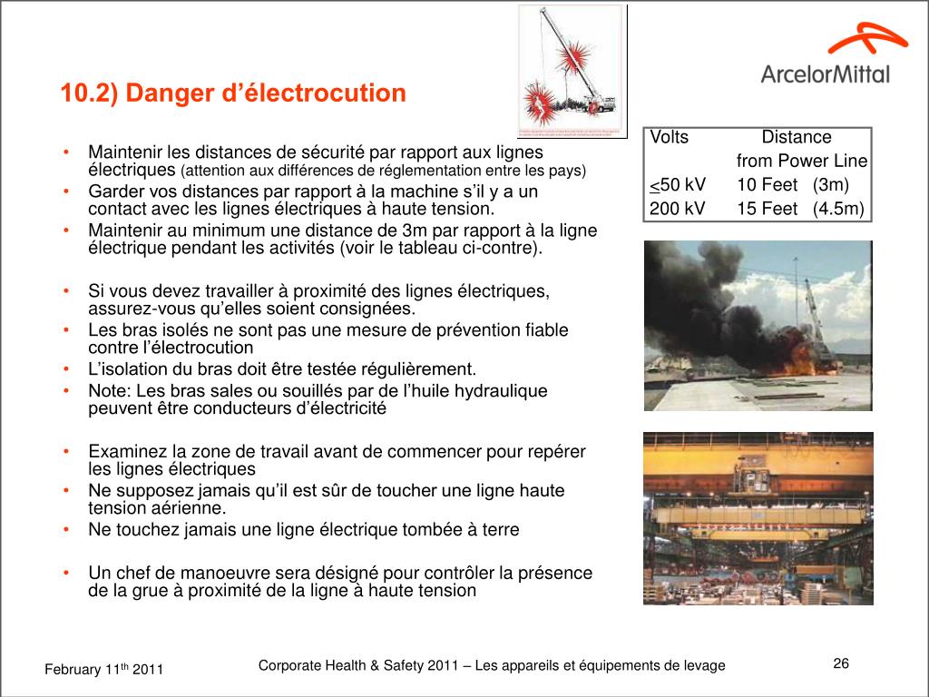 10.2) Danger d’électrocution Volts Distance from Power Line <50 kV 10 Feet (3m) 200 kV 15 Feet (4.5m) • Maintenir les distances de sécurité par rapport aux lignes électriques (attention aux différences de réglementation entre les pays) • Garder vos distances par rapport à la machine s’il y a un contact avec les lignes électriques à haute tension. • Maintenir au minimum une distance de 3m par rapport à la ligne électrique pendant les activités (voir le tableau ci-contre). • Si vous devez travailler à proximité des lignes électriques, assurez-vous qu’elles soient consignées. • Les bras isolés ne sont pas une mesure de prévention fiable contre l’électrocution • L’isolation du bras doit être testée régulièrement. • Note: Les bras sales ou souillés par de l’huile hydraulique peuvent être conducteurs d’électricité • Examinez la zone de travail avant de commencer pour repérer les lignes électriques • Ne supposez jamais qu’il est sûr de toucher une ligne haute tension aérienne. • Ne touchez jamais une ligne électrique tombée à terre • Un chef de manoeuvre sera désigné pour contrôler la présence de la grue à proximité de la ligne à haute tension Corporate Health & Safety 2011 – Les appareils et équipements de levage