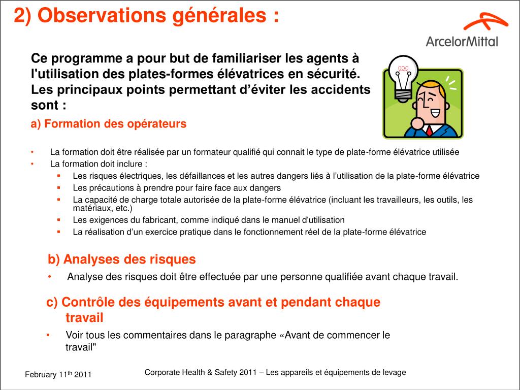 2) Observations générales : Ce programme a pour but de familiariser les agents à l'utilisation des plates-formes élévatrices en sécurité.Les principaux points permettant d’éviter les accidents sont : a) Formation des opérateurs • La formation doit être réalisée par un formateur qualifié qui connait le type de plate-forme élévatrice utilisée • La formation doit inclure : • Les risques électriques, les défaillances et les autres dangers liés à l’utilisation de la plate-forme élévatrice • Les précautions à prendre pour faire face aux dangers • La capacité de charge totale autorisée de la plate-forme élévatrice (incluant les travailleurs, les outils, les matériaux, etc.) • Les exigences du fabricant, comme indiqué dans le manuel d'utilisation • La réalisation d’un exercice pratique dans le fonctionnement réel de la plate-forme élévatrice b) Analyses des risques • Analyse des risquesdoit être effectuée par une personne qualifiée avant chaque travail. c) Contrôle des équipements avant et pendant chaque travail • Voir tous les commentaires dans le paragraphe «Avant de commencer le travail" Corporate Health & Safety 2011 – Les appareils et équipements de levage