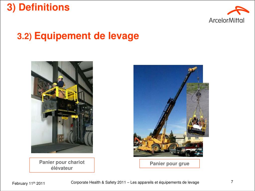 3) Definitions 3.2) Equipement de levage Panier pour chariot élévateur Panier pour grue Corporate Health & Safety 2011 – Les appareils et équipements de levage