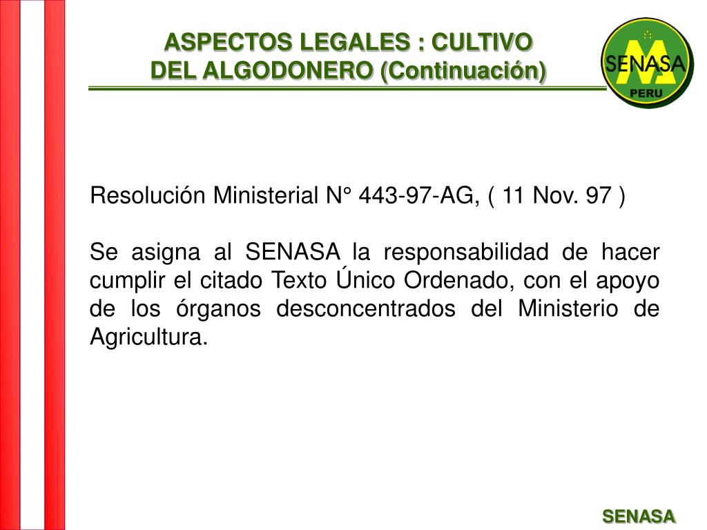 ASPECTOS LEGALES : CULTIVO DEL ALGODONERO (Continuación) • El mismo Texto Único Ordenado establece que el Ministerio de Agricultura por intermedio de las Direcciones Regionales y Sub-regionales de Agricultura o Unidad Agraria Departamental de Lima - Callao, delegarán en las Agencias Agrarias de los respectivos valles, el cumplimiento de las disposiciones allí contenidas. SENASA