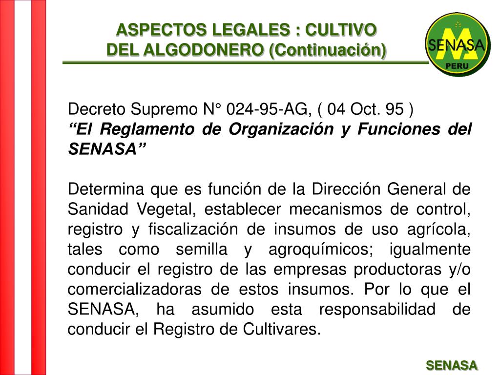 ASPECTOS LEGALES : CULTIVO DEL ALGODONERO (Continuación) Decreto Supremo N° 024-95-AG, ( 04 Oct. 95 ) “El Reglamento de Organización y Funciones del SENASA” Determina que es función de la Dirección General de Sanidad Vegetal, establecer mecanismos de control, registro y fiscalización de insumos de uso agrícola, tales como semilla y agroquímicos; igualmente conducir el registro de las empresas productoras y/o comercializadoras de estos insumos. Por lo que el SENASA, ha asumido esta responsabilidad de conducir el Registro de Cultivares. SENASA