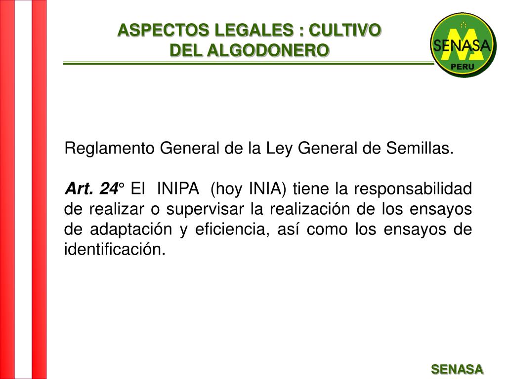ASPECTOS LEGALES : CULTIVO DEL ALGODONERO Reglamento General de la Ley General de Semillas. Art. 24° El INIPA (hoy INIA) tiene la responsabilidad de realizar o supervisar la realización de los ensayos de adaptación y eficiencia, así como los ensayos de identificación. SENASA