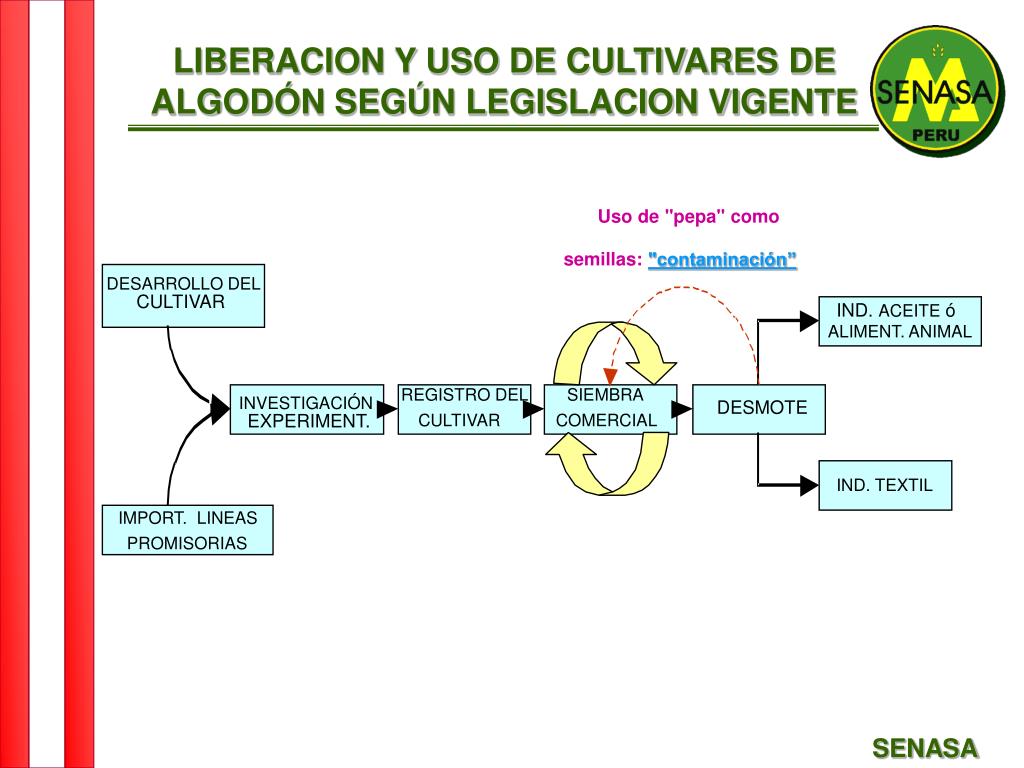 Uso de "pepa" como semillas:"contaminación” LIBERACION Y USO DE CULTIVARES DE ALGODÓN SEGÚN LEGISLACION VIGENTE DESARROLLO DEL CULTIVAR IND. ACEITE ó ALIMENT. ANIMAL REGISTRO DEL SIEMBRA INVESTIGACIÓN - DESMOTE EXPERIMENT. CULTIVAR COMERCIAL IND. TEXTIL IMPORT. LINEAS PROMISORIAS SENASA