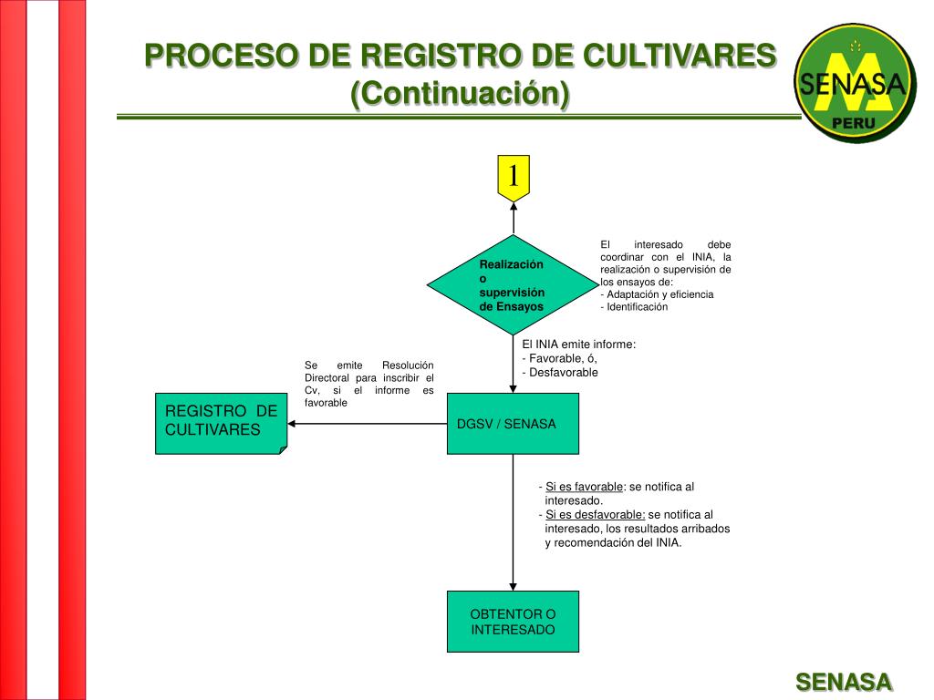 PROCESO DE REGISTRO DE CULTIVARES (Continuación) 1 El interesado debe coordinar con el INIA, la realización o supervisión de los ensayos de: - Adaptación y eficiencia - Identificación Realización o supervisión de Ensayos El INIA emite informe: - Favorable, ó, - Desfavorable Se emite Resolución Directoral para inscribir el Cv, si el informe es favorable REGISTRO DE CULTIVARES DGSV / SENASA - Si es favorable: se notifica al interesado. - Si es desfavorable: se notifica al interesado, los resultados arribados y recomendación del INIA. OBTENTOR O INTERESADO SENASA