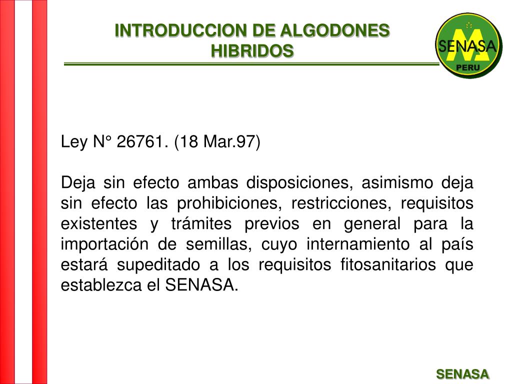 INTRODUCCION DE ALGODONES HIBRIDOS Ley N° 26761. (18 Mar.97) Deja sin efecto ambas disposiciones, asimismo deja sin efecto las prohibiciones, restricciones, requisitos existentes y trámites previos en general para la importación de semillas, cuyo internamiento al país estará supeditado a los requisitos fitosanitarios que establezca el SENASA. SENASA