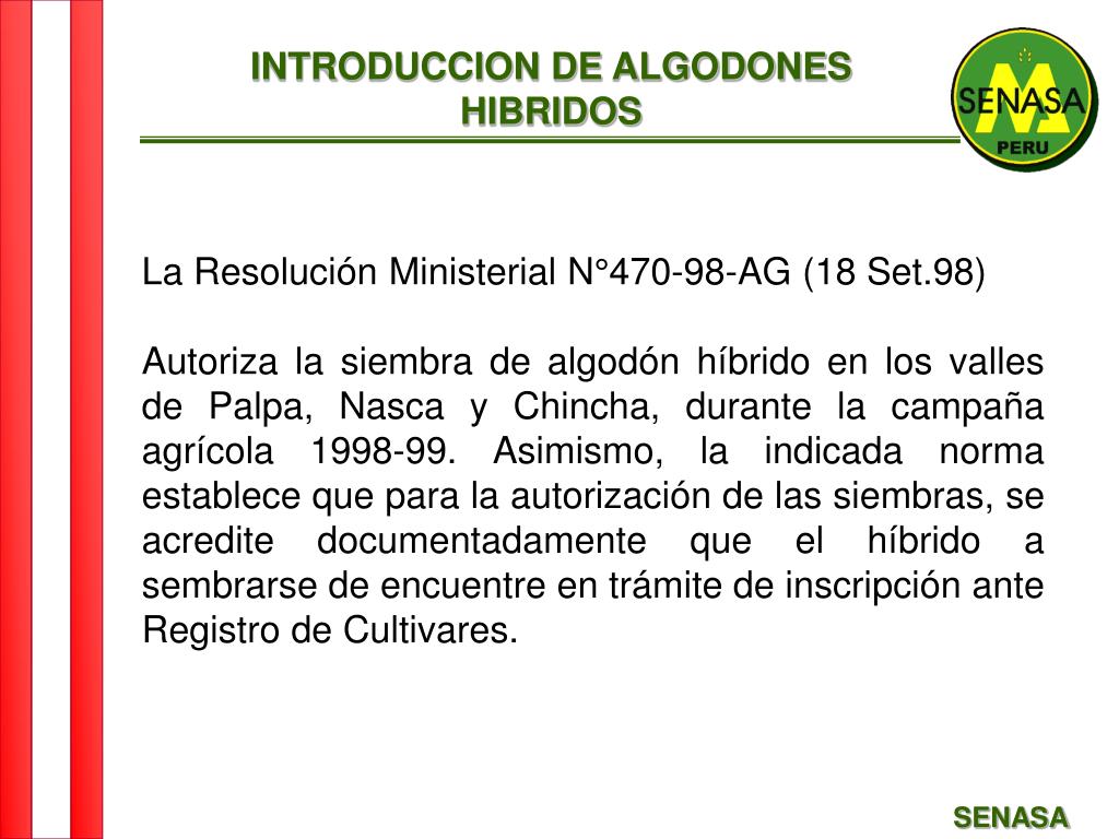 INTRODUCCION DE ALGODONES HIBRIDOS La Resolución Ministerial N°470-98-AG (18 Set.98) Autoriza la siembra de algodón híbrido en los valles de Palpa, Nasca y Chincha, durante la campaña agrícola 1998-99. Asimismo, la indicada norma establece que para la autorización de las siembras, se acredite documentadamente que el híbrido a sembrarse de encuentre en trámite de inscripción ante Registro de Cultivares. SENASA