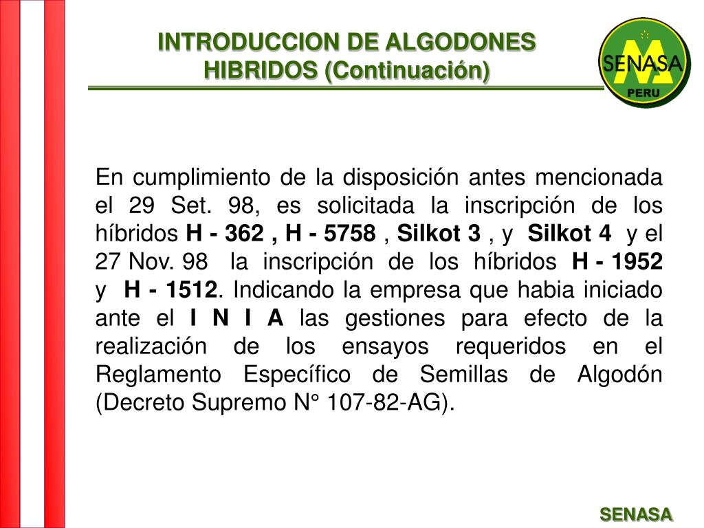 INTRODUCCION DE ALGODONES HIBRIDOS (Continuación) En cumplimiento de la disposición antes mencionada el 29 Set. 98, es solicitada la inscripción de los híbridos H - 362 , H - 5758 , Silkot 3 , y Silkot 4 y el 27 Nov. 98 la inscripción de los híbridos H - 1952 y H - 1512. Indicando la empresa que habia iniciado ante el I N I A las gestiones para efecto de la realización de los ensayos requeridos en el Reglamento Específico de Semillas de Algodón (Decreto Supremo N° 107-82-AG). SENASA