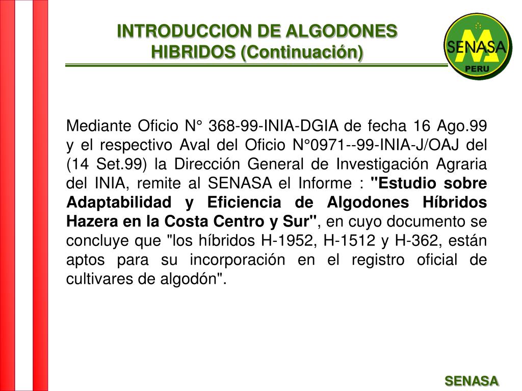 INTRODUCCION DE ALGODONES HIBRIDOS (Continuación) Mediante Oficio N° 368-99-INIA-DGIA de fecha 16 Ago.99 y el respectivo Aval del Oficio N°0971--99-INIA-J/OAJ del (14 Set.99) la Dirección General de Investigación Agraria del INIA, remite al SENASA el Informe : "Estudio sobre Adaptabilidad y Eficiencia de Algodones Híbridos Hazera en la Costa Centro y Sur", en cuyo documento se concluye que "los híbridos H-1952, H-1512 y H-362, están aptos para su incorporación en el registro oficial de cultivares de algodón". SENASA