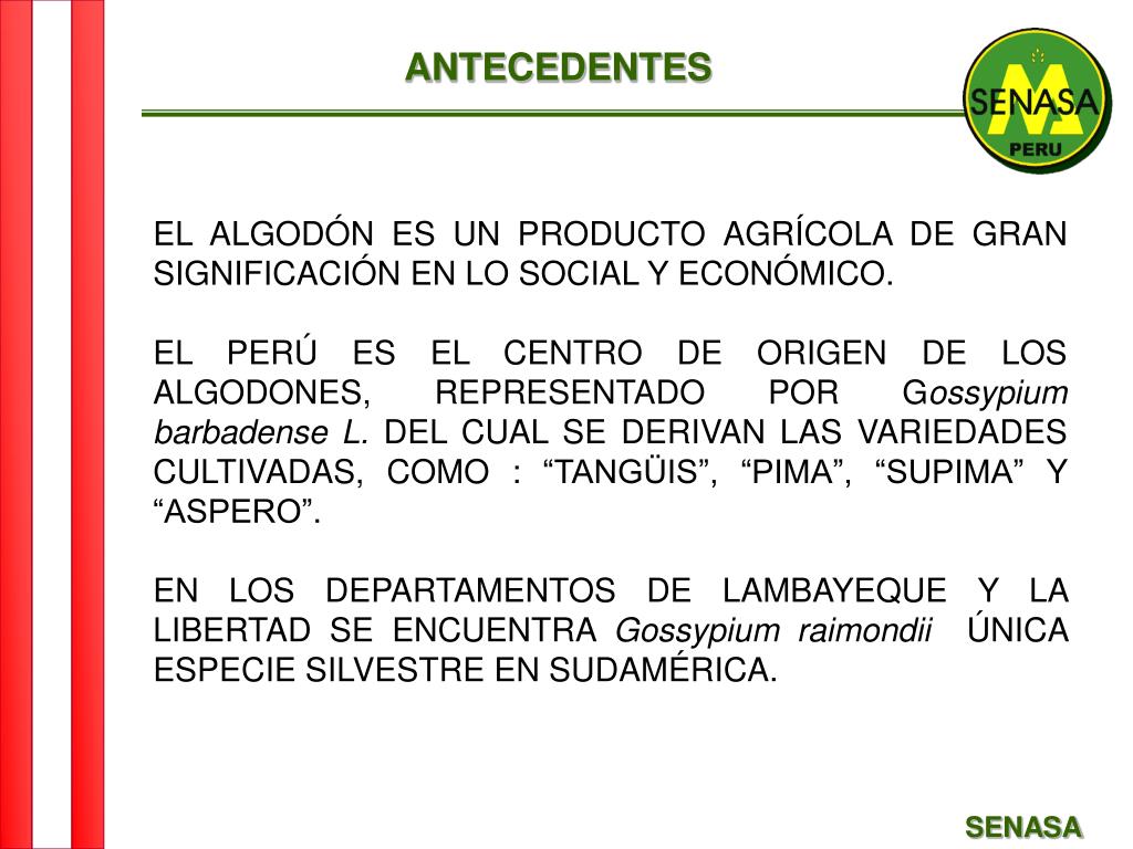 ANTECEDENTES EL ALGODÓN ES UN PRODUCTO AGRÍCOLA DE GRAN SIGNIFICACIÓN EN LO SOCIAL Y ECONÓMICO. EL PERÚ ES EL CENTRO DE ORIGEN DE LOS ALGODONES, REPRESENTADO POR Gossypium barbadense L. DEL CUAL SE DERIVAN LAS VARIEDADES CULTIVADAS, COMO : “TANGÜIS”, “PIMA”, “SUPIMA” Y “ASPERO”. EN LOS DEPARTAMENTOS DE LAMBAYEQUE Y LA LIBERTAD SE ENCUENTRA Gossypium raimondii ÚNICA ESPECIE SILVESTRE EN SUDAMÉRICA. SENASA