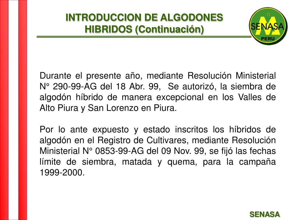 INTRODUCCION DE ALGODONES HIBRIDOS (Continuación) Durante el presente año, mediante Resolución Ministerial N° 290-99-AG del 18 Abr. 99, Se autorizó, la siembra de algodón híbrido de manera excepcional en los Valles de Alto Piura y San Lorenzo en Piura. Por lo ante expuesto y estado inscritos los híbridos de algodón en el Registro de Cultivares, mediante Resolución Ministerial N° 0853-99-AG del 09 Nov. 99, se fijó las fechas límite de siembra, matada y quema, para la campaña 1999-2000. SENASA