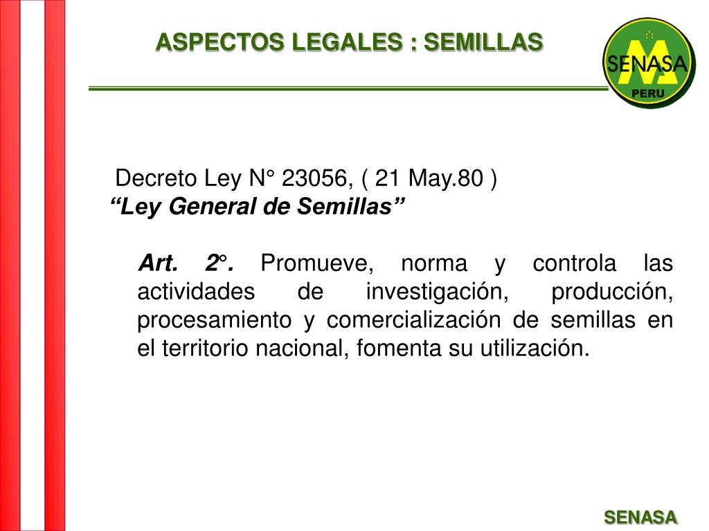 ASPECTOS LEGALES : SEMILLAS • Decreto Ley N° 23056, ( 21 May.80 ) • “Ley General de Semillas” • Art. 2°. Promueve, norma y controla las actividades de investigación, producción, procesamiento y comercialización de semillas en el territorio nacional, fomenta su utilización. SENASA