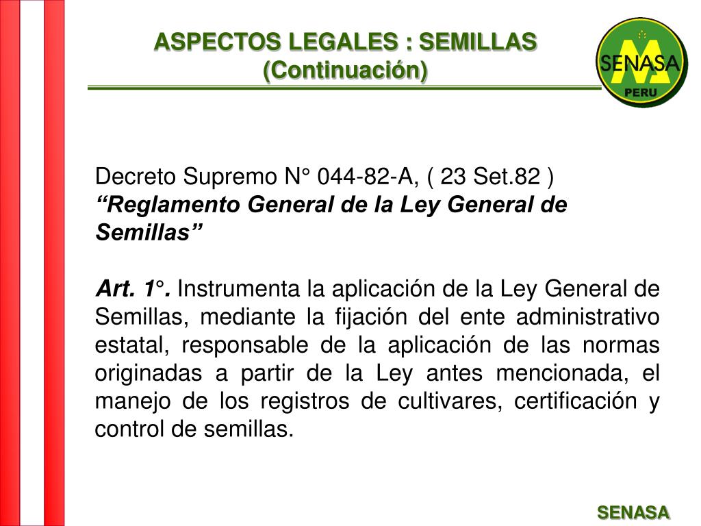 ASPECTOS LEGALES : SEMILLAS (Continuación) Decreto Supremo N° 044-82-A, ( 23 Set.82 ) “Reglamento General de la Ley General de Semillas” Art. 1°. Instrumenta la aplicación de la Ley General de Semillas, mediante la fijación del ente administrativo estatal, responsable de la aplicación de las normas originadas a partir de la Ley antes mencionada, el manejo de los registros de cultivares, certificación y control de semillas. SENASA