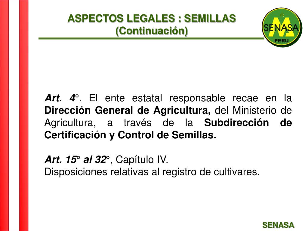 ASPECTOS LEGALES : SEMILLAS (Continuación) Art. 4°. El ente estatal responsable recae en la Dirección General de Agricultura, del Ministerio de Agricultura, a través de la Subdirección de Certificación y Control de Semillas. Art. 15° al 32°, Capítulo IV. Disposiciones relativas al registro de cultivares. SENASA