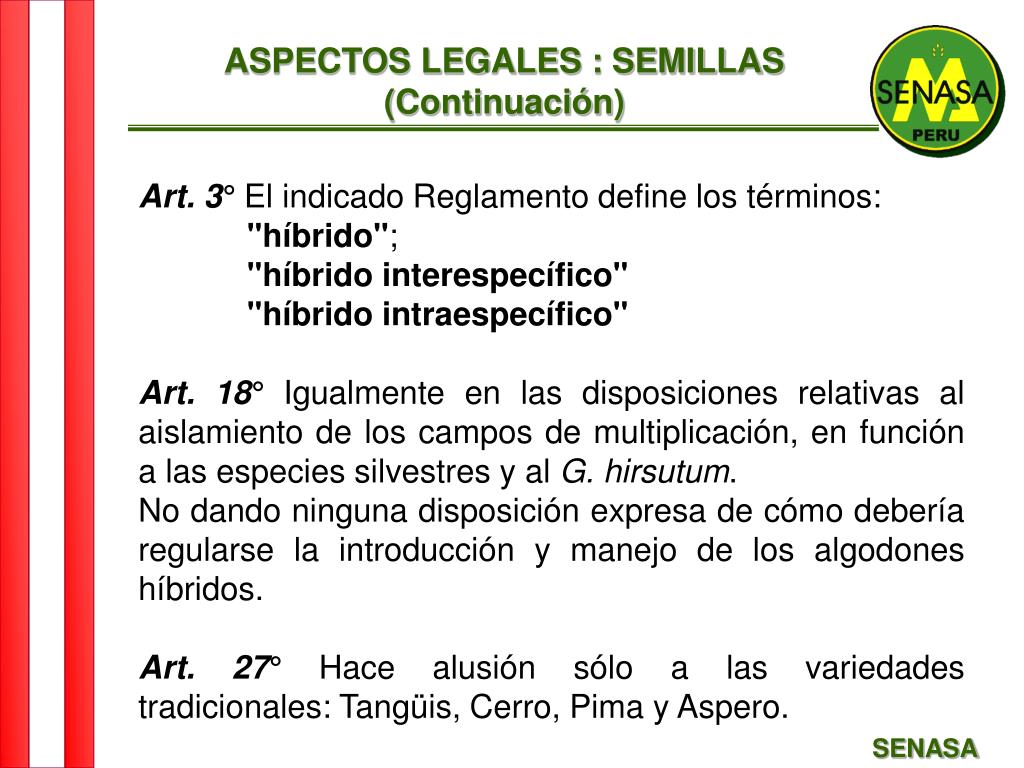 ASPECTOS LEGALES : SEMILLAS (Continuación) • Decreto Supremo N° 107-82-AG, ( 23 Set.82 ) • El Reglamento Específico de Semillas de Algodón. • Art. 2°.Establece que dentro del término algodón, comprende al género Gossypium y las especies que se cultivan en el país, entre ellas: • Gossypium barbadense L. (País, Aspero, Tangüis, Pima, etc.) • Gossypium hirsutum L. (Upland, etc.) • Híbridos del género Gossypium (Pima S, Del Cerro, etc.) SENASA