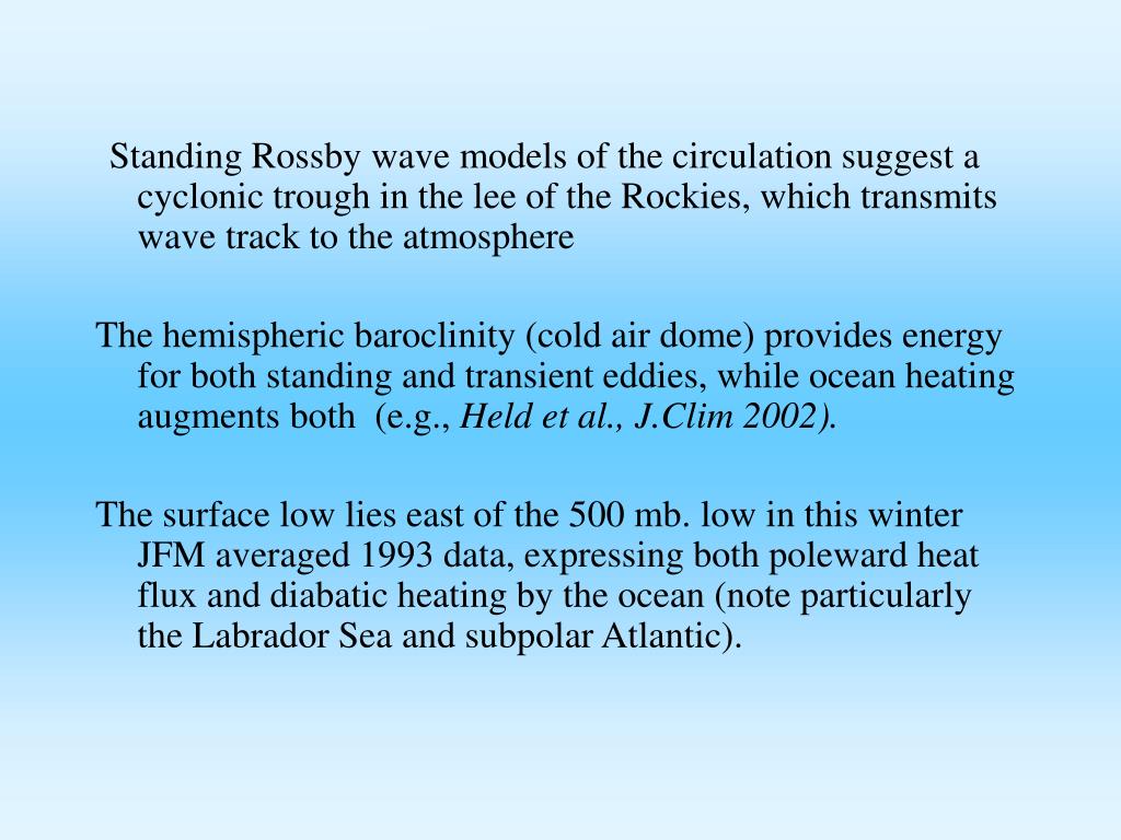 Standing Rossby wave models of the circulation suggest a cyclonic trough in the lee of the Rockies, which transmits wave track to the atmosphere The hemispheric baroclinity (cold air dome) provides energy for both standing and transient eddies, while ocean heating augments both (e.g., Held et al., J.Clim 2002). The surface low lies east of the 500 mb. low in this winter JFM averaged 1993 data, expressing both poleward heat flux and diabatic heating by the ocean (note particularly the Labrador Sea and subpolar Atlantic).