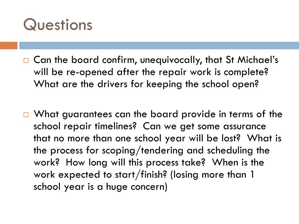 Questions • Can the board confirm, unequivocally, that St Michael’s will be re-opened after the repair work is complete? What are the drivers for keeping the school open? • What guarantees can the board provide in terms of the school repair timelines? Can we get some assurance that no more than one school year will be lost? What is the process for scoping/tendering and scheduling the work? How long will this process take? When is the work expected to start/finish? (losing more than 1 school year is a huge concern)