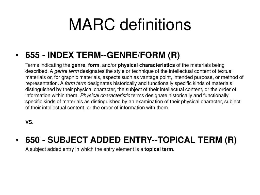 MARC definitions • 655 - INDEX TERM--GENRE/FORM (R) Terms indicating the genre, form, and/or physical characteristicsof the materials being described. A genre term designates the style or technique of the intellectual content of textual materials or, for graphic materials, aspects such as vantage point, intended purpose, or method of representation. A form term designates historically and functionally specific kinds of materials distinguished by their physical character, the subject of their intellectual content, or the order of information within them. Physical characteristic terms designate historically and functionally specific kinds of materials as distinguished by an examination of their physical character, subject of their intellectual content, or the order of information with them VS. • 650 - SUBJECT ADDED ENTRY--TOPICAL TERM (R) A subject added entry in which the entry element is a topical term.
