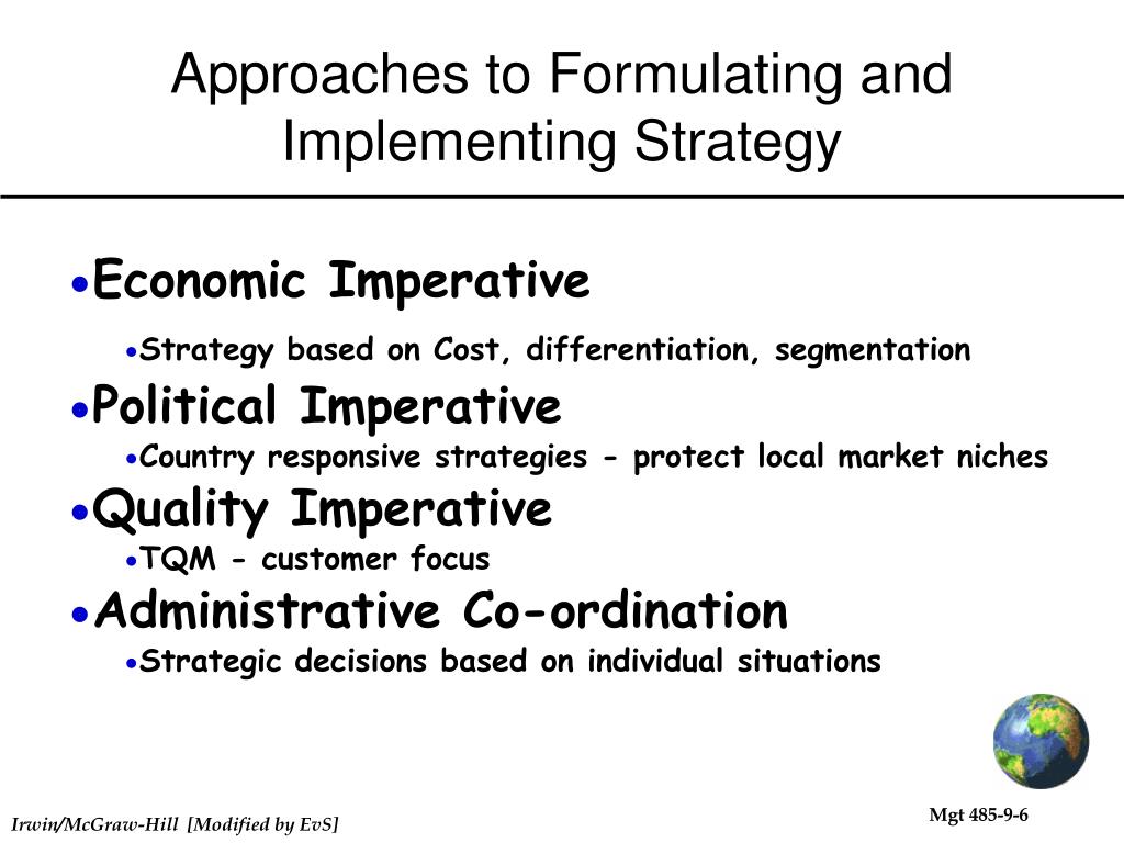 Approaches to Formulating and Implementing Strategy • Economic Imperative • Strategy based on Cost, differentiation, segmentation • Political Imperative • Country responsive strategies - protect local market niches • Quality Imperative • TQM - customer focus • Administrative Co-ordination • Strategic decisions based on individual situations