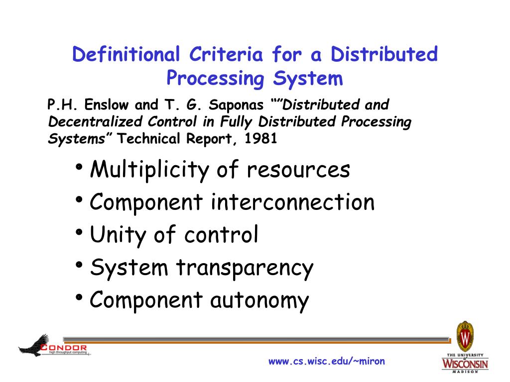 Definitional Criteria for a Distributed Processing System P.H. Enslow and T. G. Saponas “”Distributed and Decentralized Control in Fully Distributed Processing Systems” Technical Report, 1981 • Multiplicity of resources • Component interconnection • Unity of control • System transparency • Component autonomy