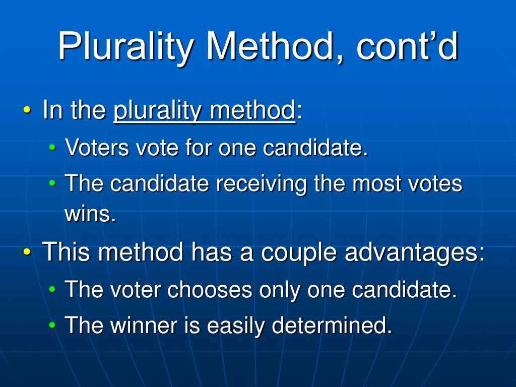 Plurality Method, cont’d • In the plurality method: • Voters vote for one candidate. • The candidate receiving the most votes wins. • This method has a couple advantages: • The voter chooses only one candidate. • The winner is easily determined.