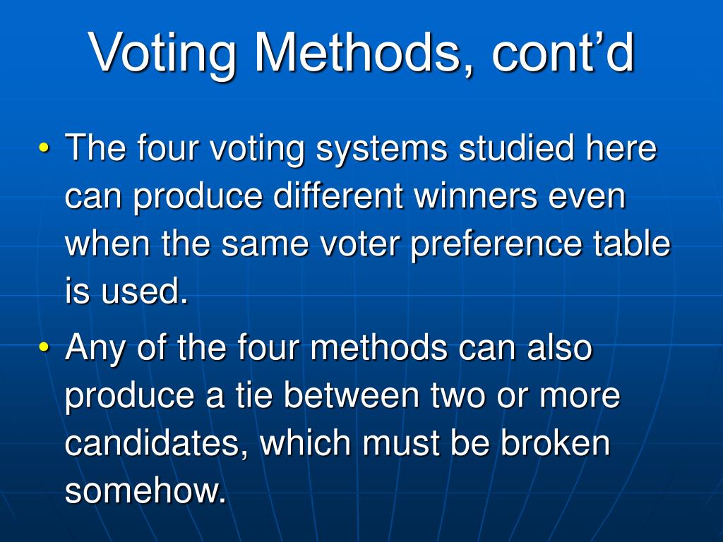 Voting Methods, cont’d • The four voting systems studied here can produce different winners even when the same voter preference table is used. • Any of the four methods can also produce a tie between two or more candidates, which must be broken somehow.