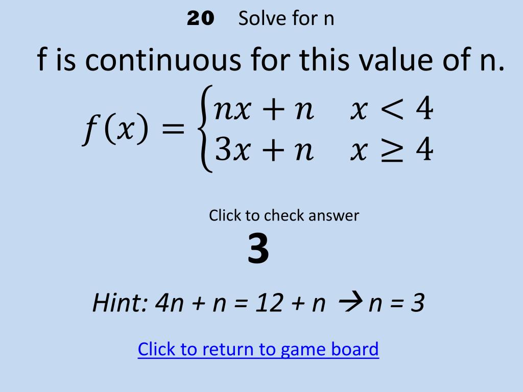 20Solve for n f is continuous for this value of n.Click to check answer 3 Hint: 4n + n = 12 + n n = 3 Click to return to game board