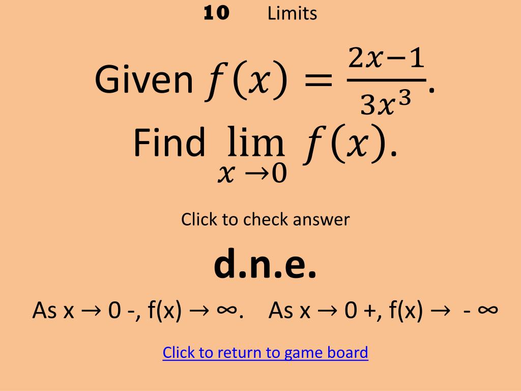 10 Limits Given . Find .Click to check answer d.n.e. As x 0 -, f(x) ∞. As x 0 +, f(x) - ∞ Click to return to game board