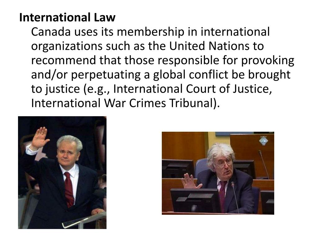 International LawCanada uses its membership in international organizations such as the United Nations to recommend that those responsible for provoking and/or perpetuating a global conflict be brought to justice (e.g., International Court of Justice, International War Crimes Tribunal).