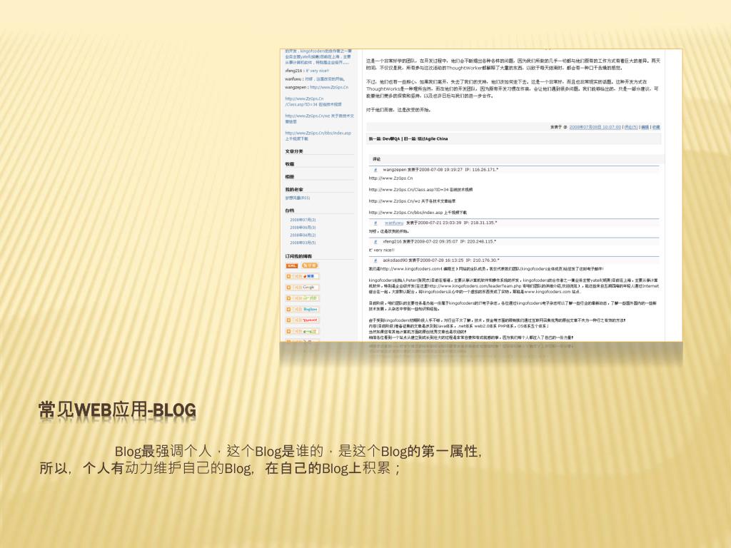 常见web应用-Blog Blog最强调个人,这个Blog是谁的,是这个Blog的第一属性,所以,个人有动力维护自己的Blog,在自己的Blog上积累;