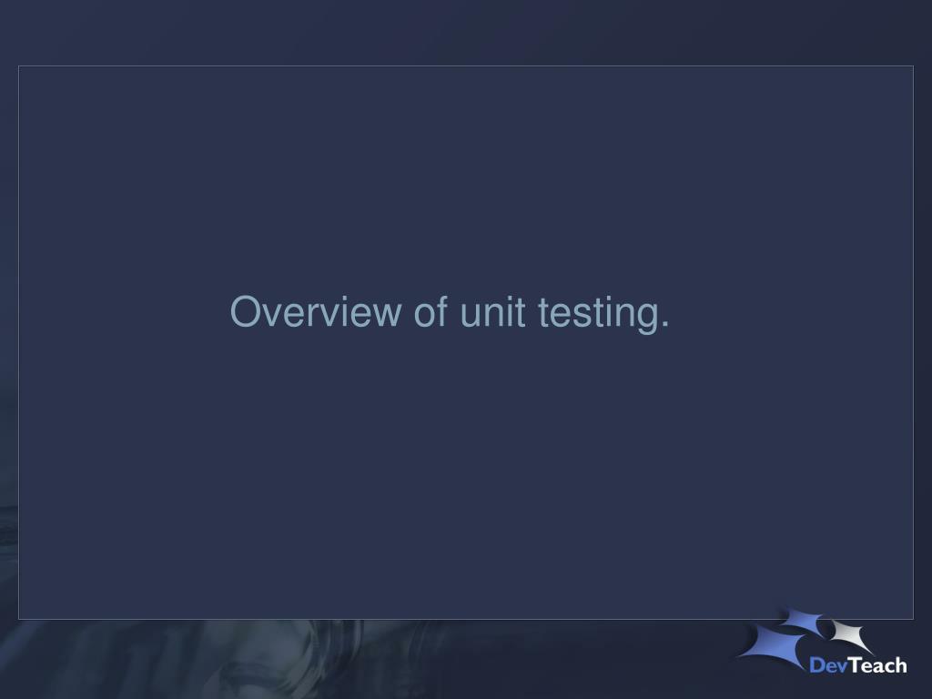 Why Write Unit Tests? • High-quality code • Fewer bugs • Clean design • Clean code • Professional Responsibility • Proof that your code works • Notification when your code is broken • Quality focus throughout the development cycle • Side Effects • Code is easier to maintain, refactor • Self-documenting