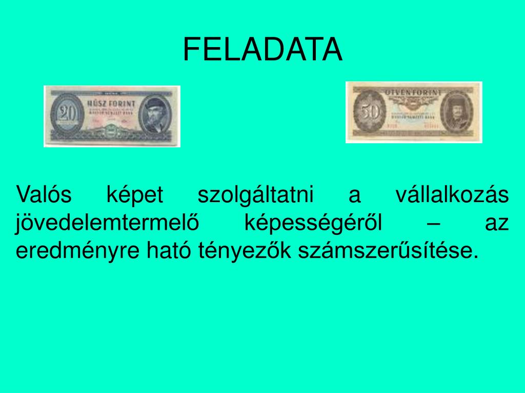 FELADATA Valós képet szolgáltatni a vállalkozás jövedelemtermelő képességéről – az eredményre ható tényezők számszerűsítése.