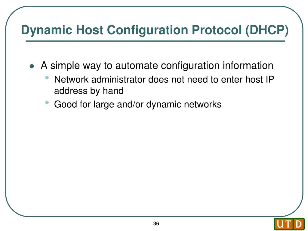 Dynamic Host Configuration Protocol (DHCP) • A simple way to automate configuration information • Network administrator does not need to enter host IP address by hand • Good for large and/or dynamic networks