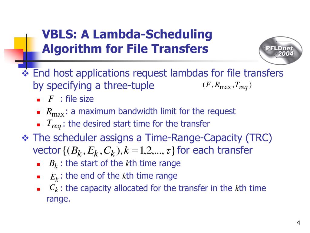 VBLS: A Lambda-Scheduling Algorithm for File Transfers • End host applications request lambdas for file transfers by specifying a three-tuple • : file size • : a maximum bandwidth limit for the request • : the desired start time for the transfer • The scheduler assigns a Time-Range-Capacity (TRC) vector for each transfer • : the start of the kth time range • : the end of the kth time range • : the capacity allocated for the transfer in the kth time range.