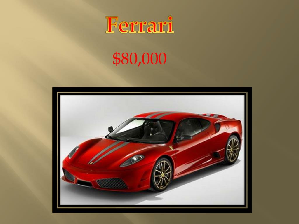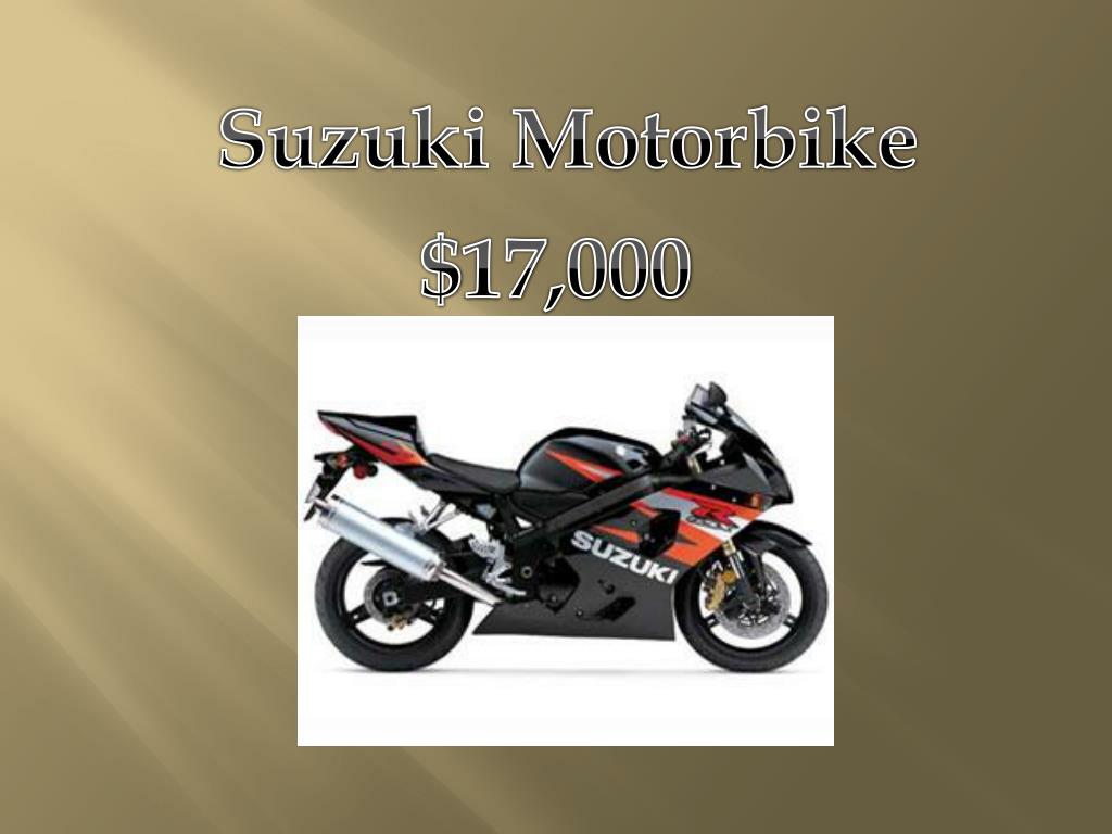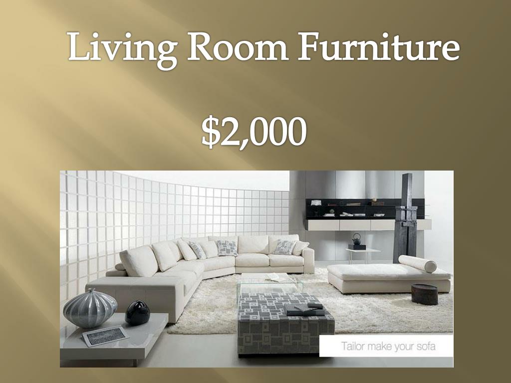 Spending One Million Dollars. By: Danik Kistol. Bugatti. $ 4 00,000. House. $300,000. Suzuki Motorbike. $ 17 ,000. Living Room Furniture. $2,000. Furniture in Bedroom. $2,000. Backyard. $5,000. Workout Room. $4,000. Kitchen. $5,000. Basketball court. $2,000. Game room. $3,000.