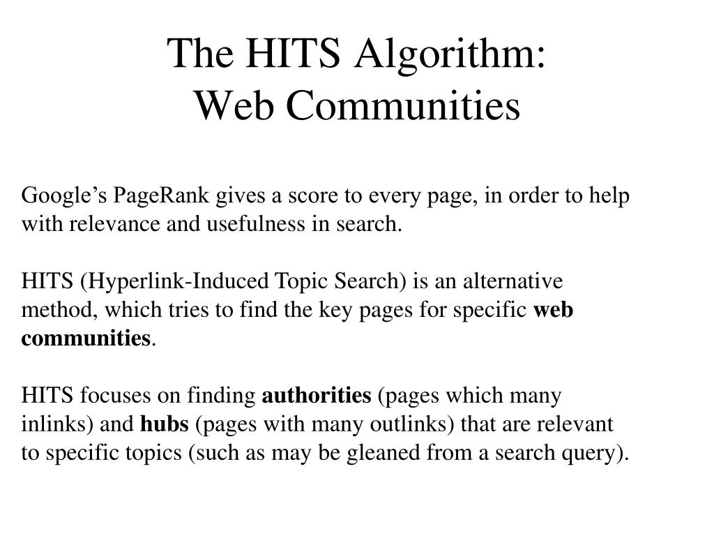The HITS Algorithm: Web Communities Google’s PageRank gives a score to every page, in order to help with relevance and usefulness in search. HITS (Hyperlink-Induced Topic Search) is an alternative method, which tries to find the key pages for specific web communities. HITS focuses on finding authorities (pages which many inlinks) and hubs (pages with many outlinks) that are relevant to specific topics (such as may be gleaned from a search query).