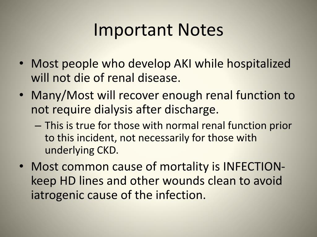 Important Notes • Most people who develop AKI while hospitalized will not die of renal disease. • Many/Most will recover enough renal function to not require dialysis after discharge. • This is true for those with normal renal function prior to this incident, not necessarily for those with underlying CKD. • Most common cause of mortality is INFECTION-keep HD lines and other wounds clean to avoid iatrogenic cause of the infection.