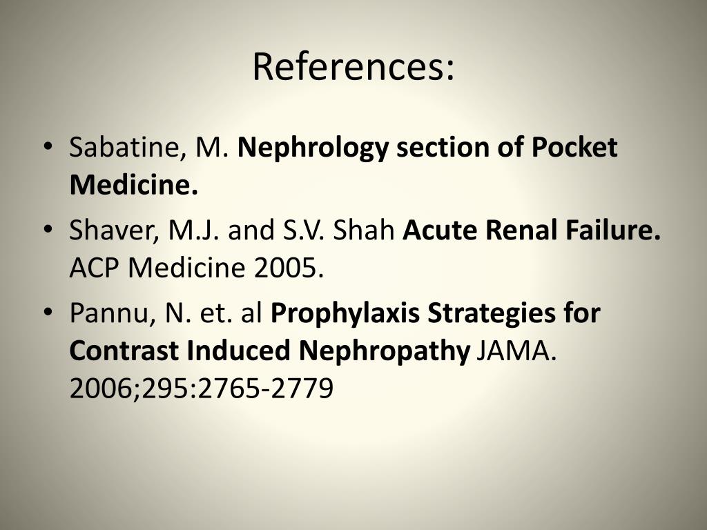 References: • Sabatine, M. Nephrology section of Pocket Medicine. • Shaver, M.J. and S.V. Shah Acute Renal Failure. ACP Medicine 2005. • Pannu, N. et. al Prophylaxis Strategies for Contrast Induced Nephropathy JAMA. 2006;295:2765-2779