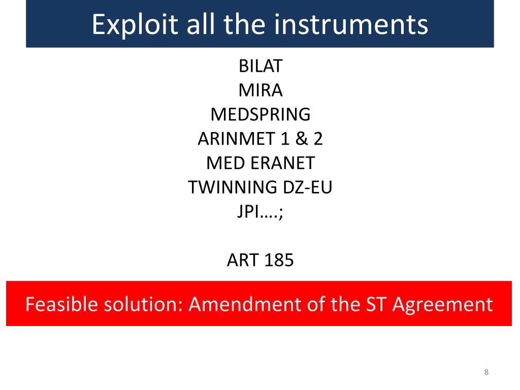 Exploit all the instruments BILAT MIRA MEDSPRING ARINMET 1 & 2 MED ERANET TWINNING DZ-EU JPI….; ART 185 Feasible solution: Amendment of the ST Agreement