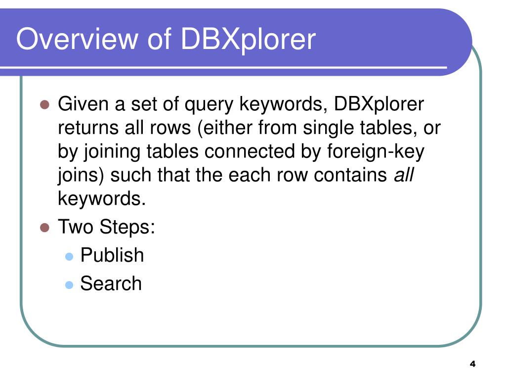 Overview of DBXplorer - Publish • Publish - a preprocessing step that enables databases for keyword search by building the symbol table and associated structures • Step 1: A database is identified, along with the set of tables and columns within the database to be published. • Step 2: Auxiliary tables are created for supporting keyword searches. • The most important structure is a symbol table S that is used at search time to efficiently determine the locations of query keywords in the database (i.e., the tables, columns, rows they occur in).