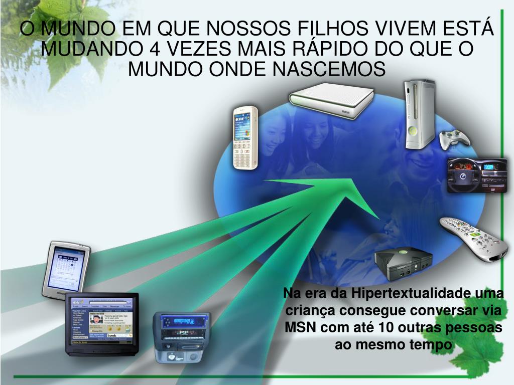 O MUNDO EM QUE NOSSOS FILHOS VIVEM ESTÁ MUDANDO 4 VEZES MAIS RÁPIDO DO QUE O MUNDO ONDE NASCEMOS Na era da Hipertextualidade uma criança consegue conversar via MSN com até 10 outras pessoas ao mesmo tempo