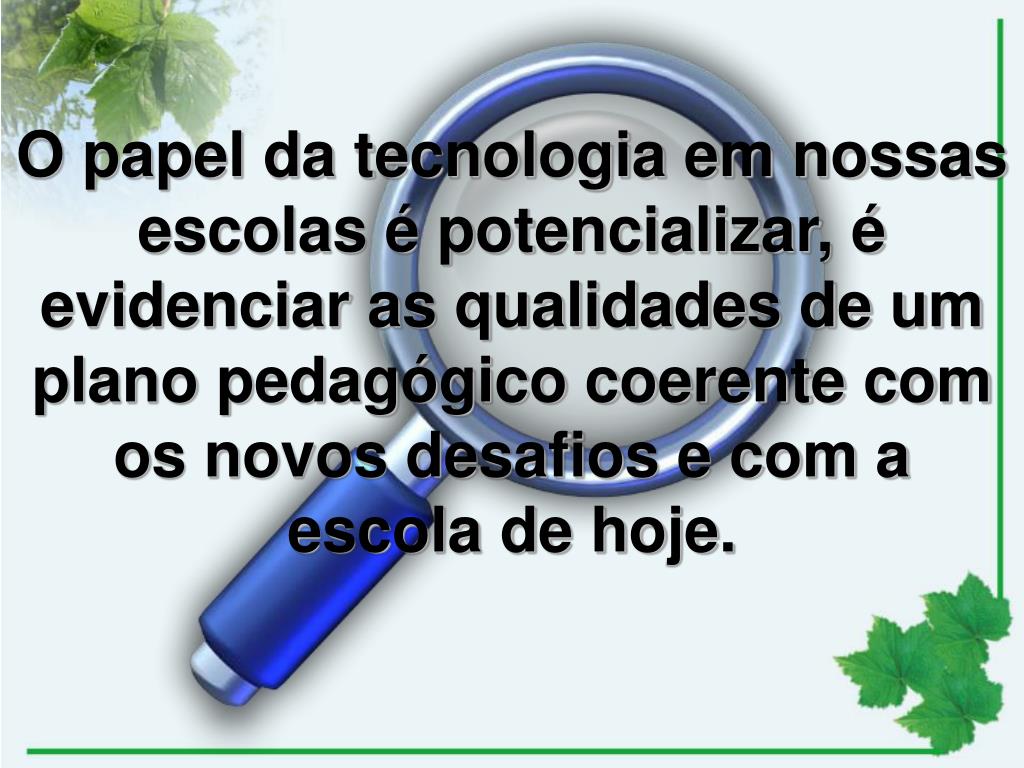 O papel da tecnologia em nossas escolas é potencializar, é evidenciar as qualidades de um plano pedagógico coerente com os novos desafios e com a escola de hoje.