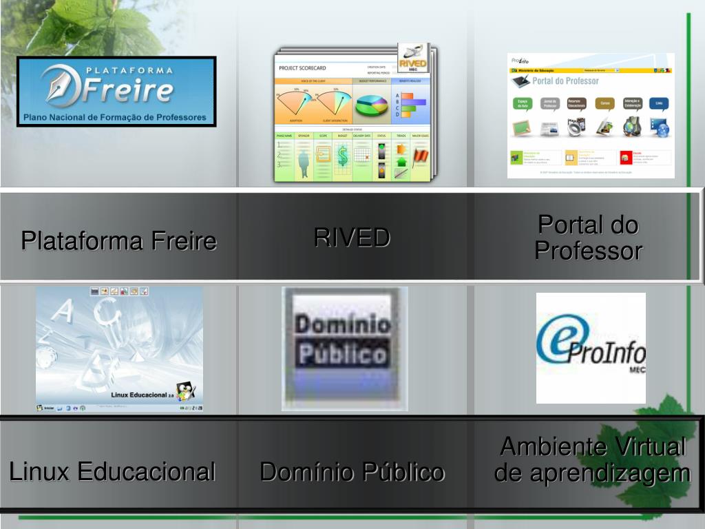 Portal do Professor RIVED Plataforma Freire Ambiente Virtual de aprendizagem Linux Educacional Domínio Público