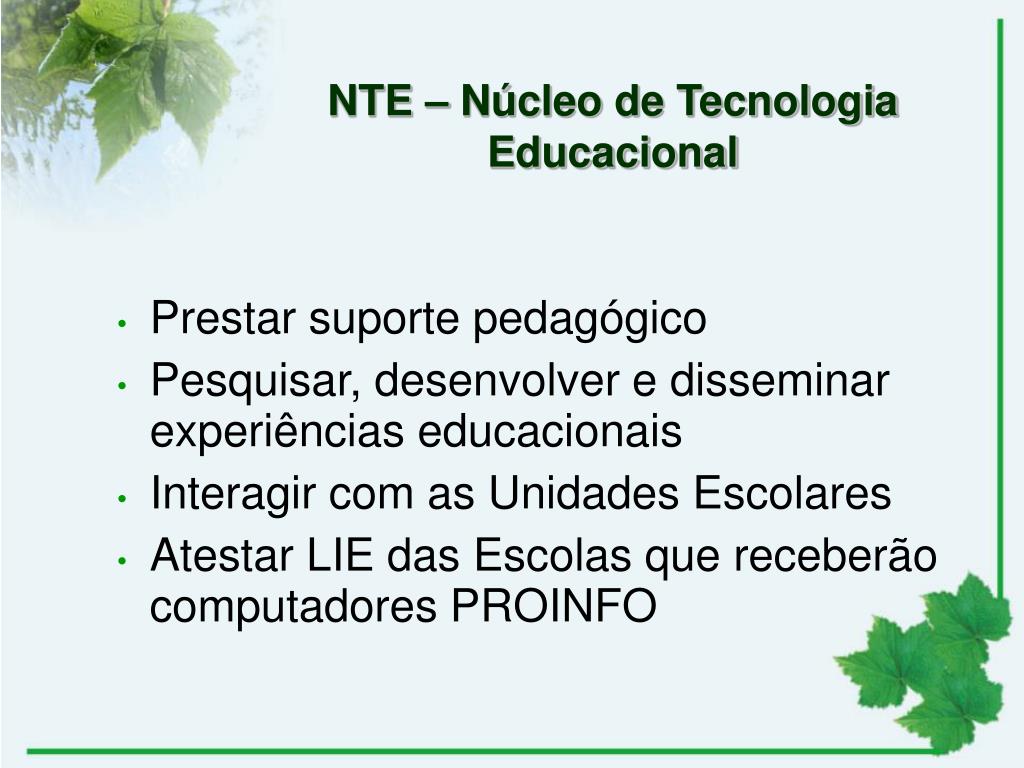NTE – Núcleo de Tecnologia Educacional • Prestar suporte pedagógico • Pesquisar, desenvolver e disseminar experiências educacionais • Interagir com as Unidades Escolares • Atestar LIE das Escolas que receberão computadores PROINFO