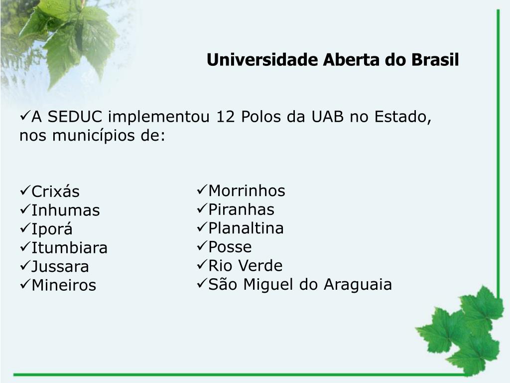 Universidade Aberta do Brasil • A SEDUC implementou 12 Polos da UAB no Estado, nos municípios de: • Crixás • Inhumas • Iporá • Itumbiara • Jussara • Mineiros • Morrinhos • Piranhas • Planaltina • Posse • Rio Verde • São Miguel do Araguaia