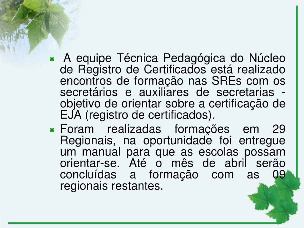 A equipe Técnica Pedagógica do Núcleo de Registro de Certificados está realizado encontros de formação nas SREs com os secretários e auxiliares de secretarias - objetivo de orientar sobre a certificação de EJA (registro de certificados). • Foram realizadas formações em 29 Regionais, na oportunidade foi entregue um manual para que as escolas possam orientar-se. Até o mês de abril serão concluídas a formação com as 09 regionais restantes.