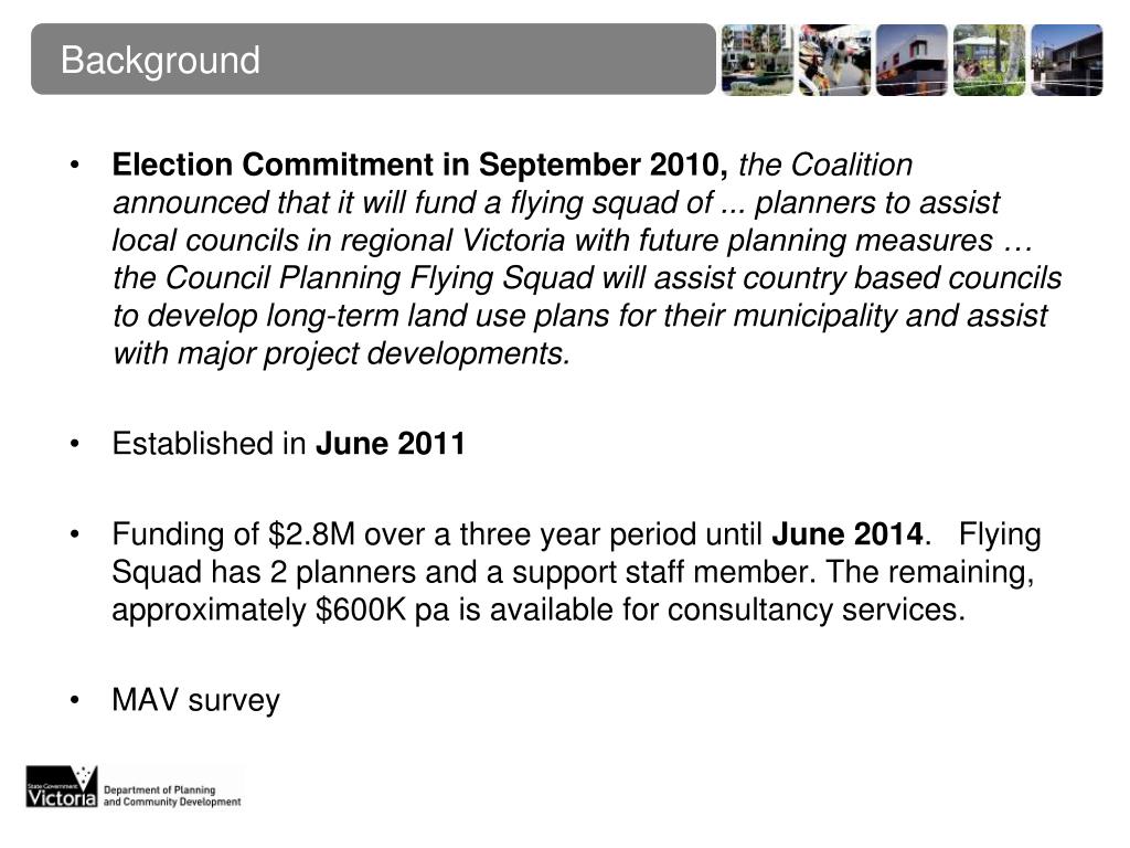 Background • Election Commitment in September 2010, the Coalition announced that it will fund a flying squad of ... planners to assist local councils in regional Victoria with future planning measures … the Council Planning Flying Squad will assist country based councils to develop long-term land use plans for their municipality and assist with major project developments. • Established in June 2011 • Funding of $2.8M over a three year period until June 2014. Flying Squad has 2 planners and a support staff member. The remaining, approximately $600K pa is available for consultancy services. • MAV survey