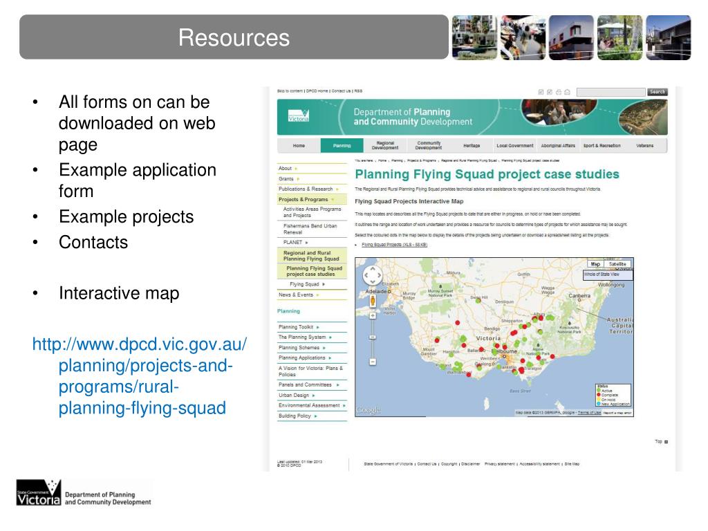 Resources • All forms on can be downloaded on web page • Example application form • Example projects • Contacts • Interactive map http://www.dpcd.vic.gov.au/planning/projects-and-programs/rural-planning-flying-squad