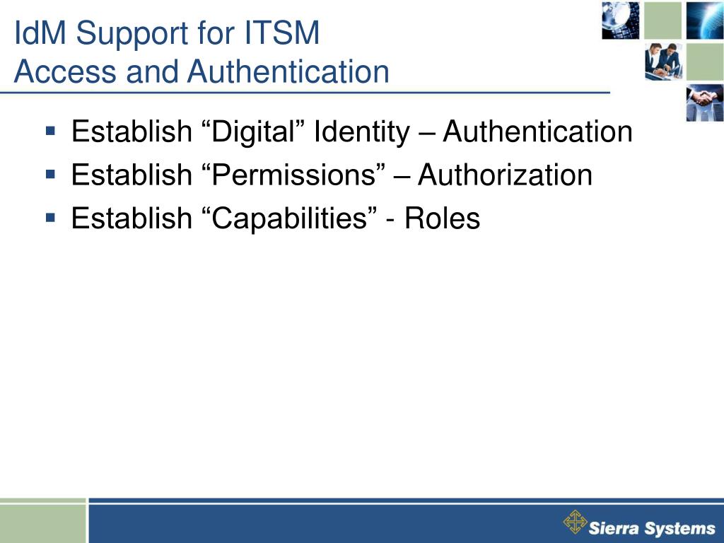 IdM Support for ITSMAccess and Authentication Establish “Digital” Identity – Authentication Establish “Permissions” – Authorization Establish “Capabilities” - Roles
